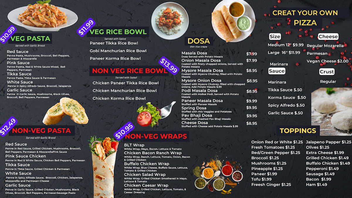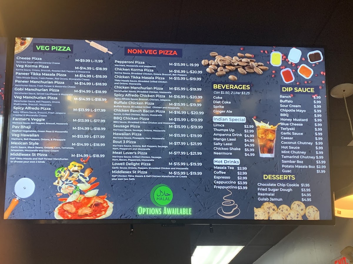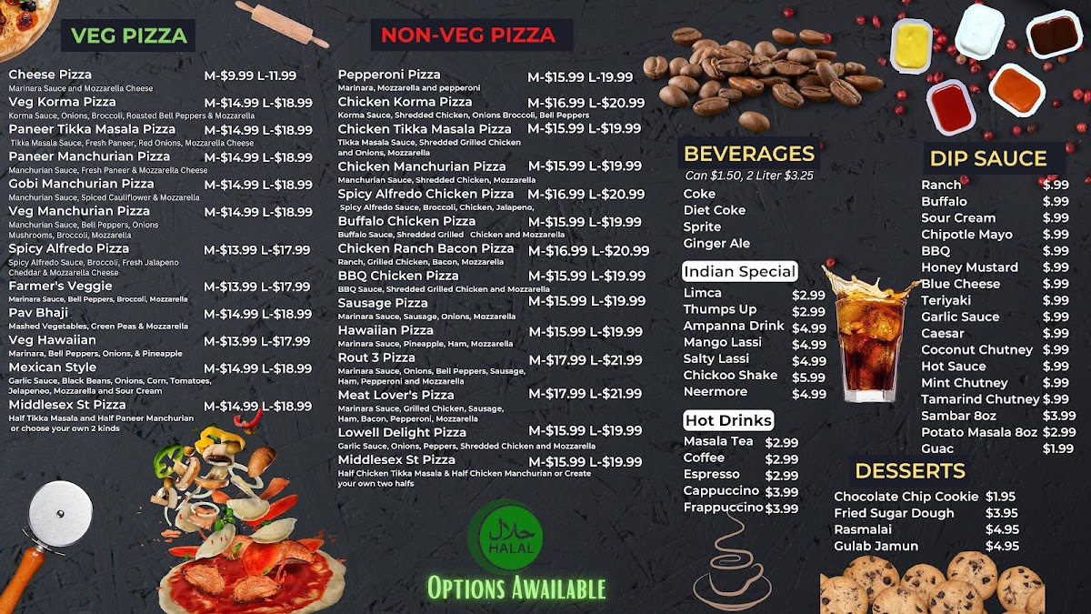 The menu is a delightful revelation for both vegetarian and non-vegetarian lovers. Highlights include the stunning Paneer Tikka Pizza, described as a “flavor bomb” with smoky paneer and gooey cheese. For meat enthusiasts, the Middlesex Street pizza combines luscious Chicken Tikka Masala and creamy Chicken Korma, promising a melt-in-your-mouth experience.
