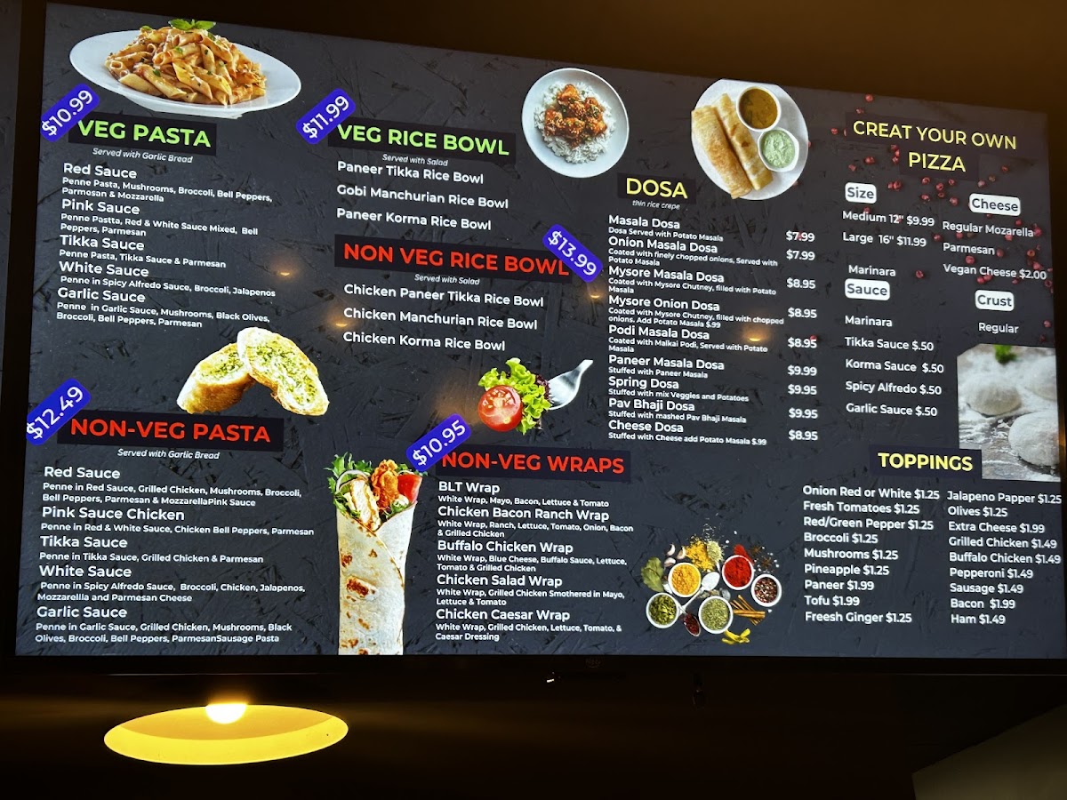 The Gobi Manchurian Pizza and Dal Makhani are also fan favorites, blending Indian spices with a Western twist.
